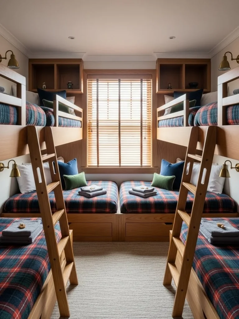 The textiles in the room are a sophisticated mix of classic alpine plaids and modern performance fabrics, using a color palette of navy blue, forest green, and cream. Each bunk is fitted with a heavy down duvet and a personalized wool blanket, ensuring that the children are as cozy as the adults in the master suites. The center of the room is an open play area covered in a plush, durable rug made of recycled fibers, designed to withstand years of activity.