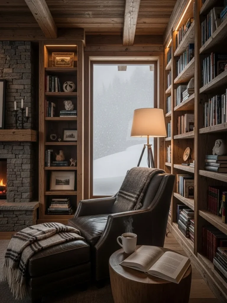 Lighting in the library is meticulously planned to reduce eye strain and enhance the mood. Small, shaded brass lamps are perched on the shelves, casting a warm glow over the spines of the books, while a focused reading light is positioned perfectly behind each chair. There is no television or digital distraction here; the only entertainment is the written word and the mesmerizing movement of the snow against the glass. It is a space designed for deep focus and the luxury of uninterrupted time.