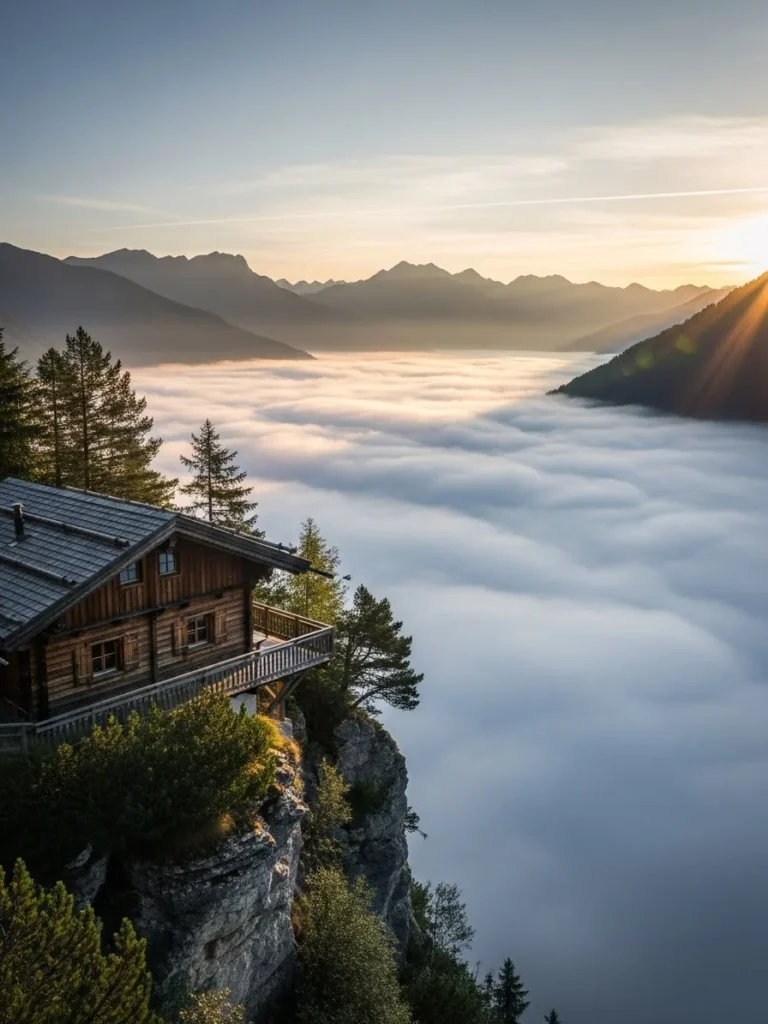 Positioned on a high ridge to capture every second of the sun’s daily journey, this chalet is a study in light and reflection. The architecture combines rustic stone foundations with expansive glass facades that turn into liquid gold as the sun dips toward the horizon. During the late afternoon, the entire structure seems to catch fire with orange and pink hues, creating a visual spectacle that can be seen from the valley floor far below.
