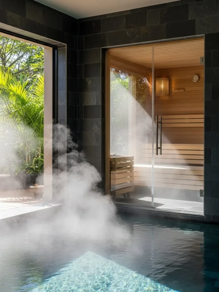 The chalet itself appears as a glowing, multi-leveled jewel box in the background, its warm interior lights contrasting with the cool, dark tones of the water and the night. Because the pool is heated to a high temperature, a thin, ethereal veil of steam rises from the surface, catching the light and adding a sense of mystery to the scene. This “mist” softens the sharp modern lines of the building, making the entire image feel like a high-end dream or a scene from a cinematic masterpiece.