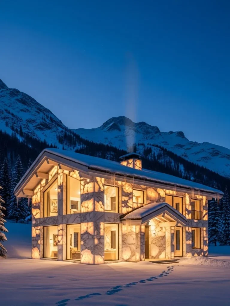 This “Translucent Marble” chalet is more than a house; it is a light installation on a domestic scale. It challenges the idea that stone must be heavy and opaque, showing instead that it can be delicate, glowing, and light-filled. For the homeowner, it offers a living experience that is constantly changing as the light shifts, providing a warm, golden sanctuary that stands as a glowing heart in the middle of the dark, cold alpine night.