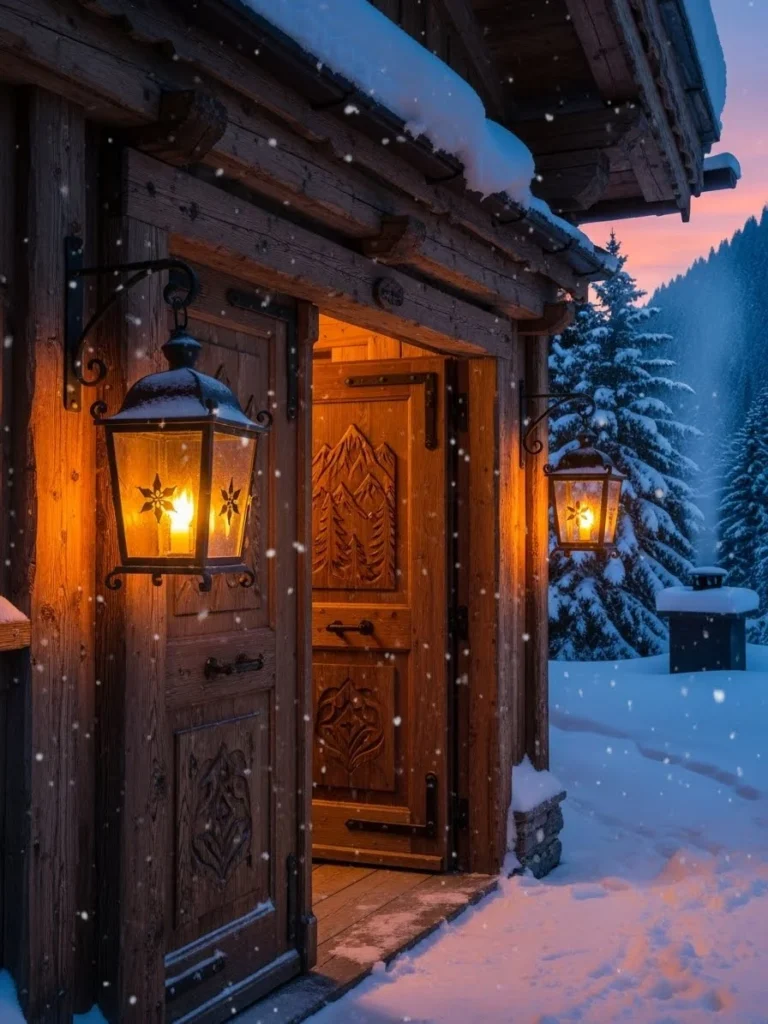 The first impression of this luxury chalet is one of overwhelming hospitality and sturdiness, centered around a grand entrance that beckons visitors out of the cold. The twin front doors are four inches thick, crafted from solid, wire-brushed oak and fitted with custom-forged iron hardware that feels substantial to the touch. Flanking the entrance are two oversized copper lanterns that house flickering, candle-like lights, casting a long and inviting glow across the fresh snow of the porch.
