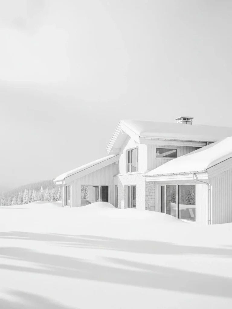 Challenging the tradition of dark mountain lodges, this chalet is a radical exercise in monochromatic design. Every element of the exterior—from the bleached cedar siding to the white-washed stone foundation—is finished in varying shades of snow-white. Against a winter landscape, the building nearly disappears, becoming a sculptural phantom in the blizzard. This “all-white” approach creates a sense of purity and light that is entirely unique in the world of high-altitude luxury.