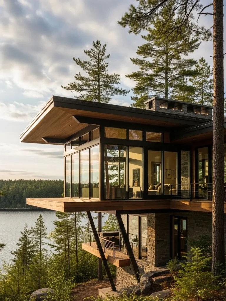 This contemporary luxury cottage features a bold cantilevered structure. Clean lines and modern materials define its striking form.