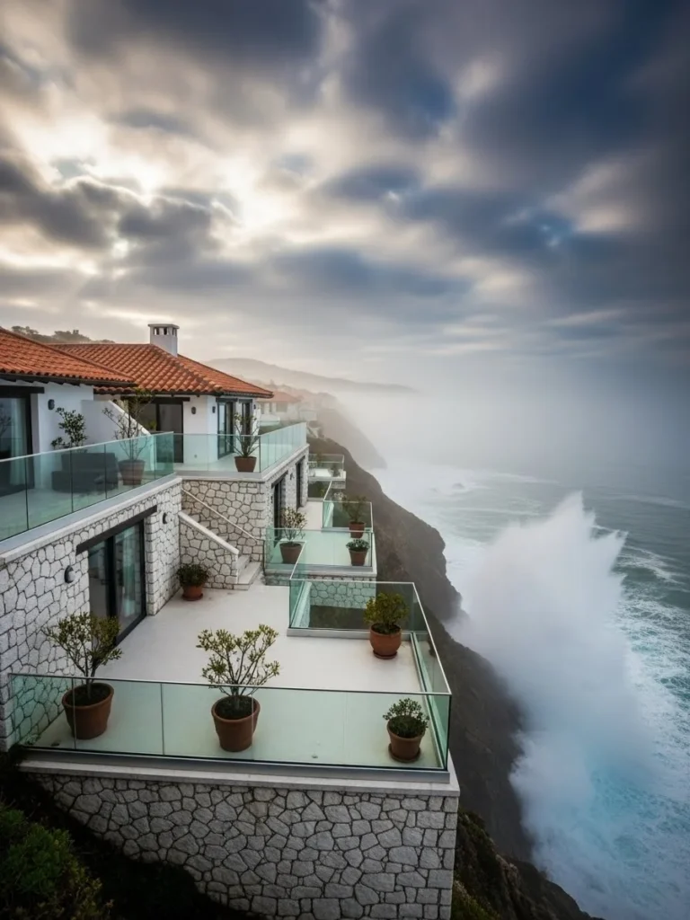 Perched dramatically on a rugged cliff, this coastal luxury cottage commands sweeping ocean views. Whitewashed stone walls and expansive terraces echo the surrounding coastal landscape.