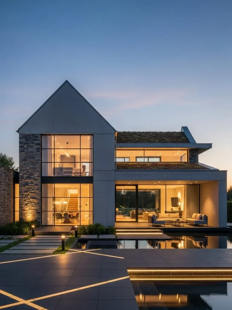This hybrid luxury cottage blends traditional cottage form with contemporary materials and detailing. At dusk, warm lighting highlights its clean lines and refined proportions.