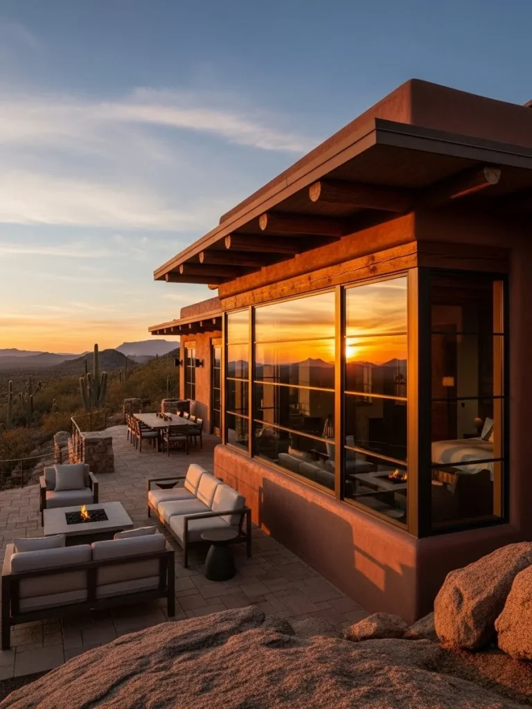 Set against a dramatic desert backdrop, this luxury cottage blends modern design with rustic influences. Earth-toned walls and natural textures mirror the surrounding landscape, allowing the structure to feel grounded and intentional.