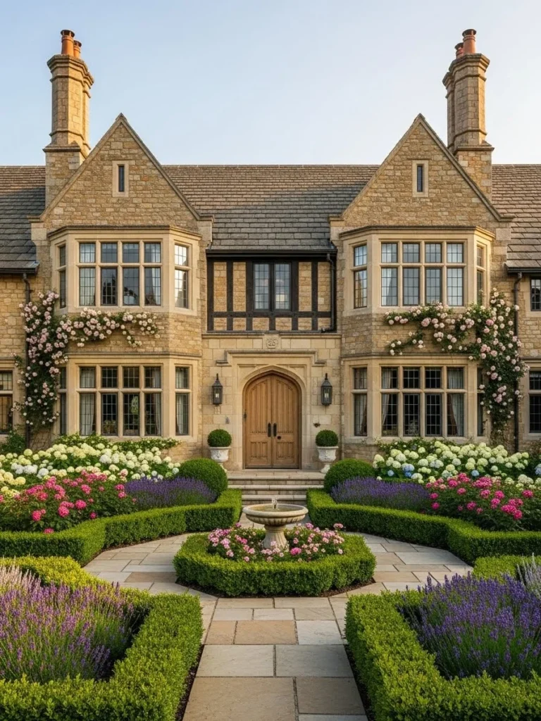 This English luxury cottage exudes romance and heritage, with ivy-draped stone walls and charming architectural details. The façade feels timeless, blending effortlessly into its lush garden surroundings filled with roses, hedges, and gravel paths.
