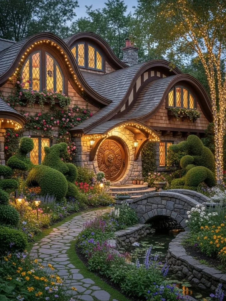 This fairytale-inspired luxury cottage feels as though it belongs to a storybook. Curved rooflines, arched windows, and organic forms give it a whimsical yet refined presence.