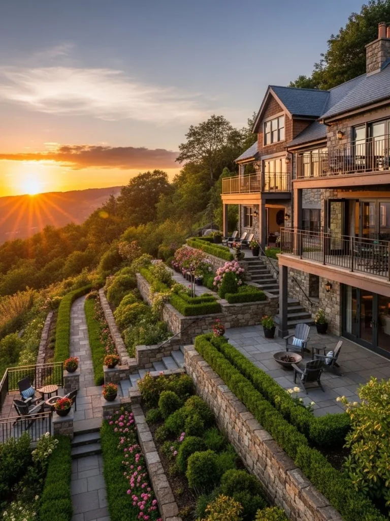 Built into a hillside, this luxury cottage features terraced stone gardens that cascade downward. The architecture follows the land’s natural contours.