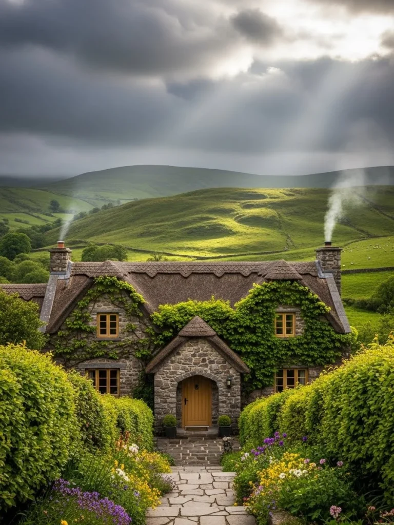 Set within rolling green hills, this Irish countryside luxury cottage feels rooted in tradition and landscape. Thick stone walls provide shelter while enhancing its timeless charm.