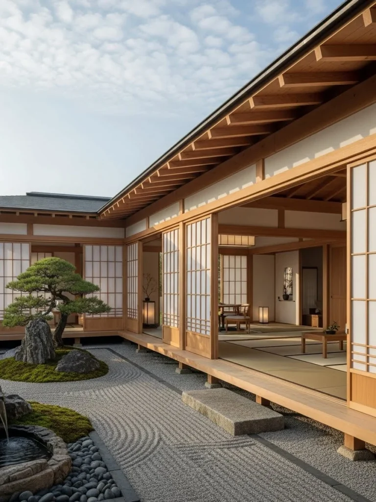 A carefully designed zen garden provides a focal point for contemplation. Sliding doors blur the line between interior and exterior.