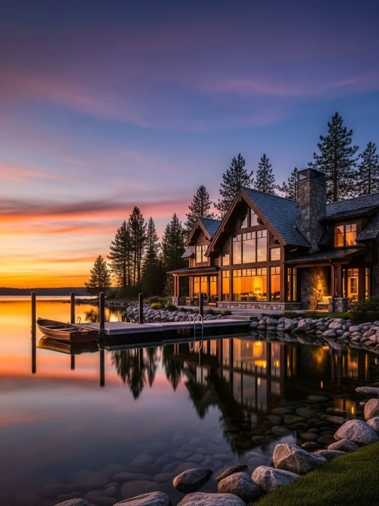This mountain lake luxury cottage is enveloped by vibrant autumn foliage. Reflections shimmer across calm water.