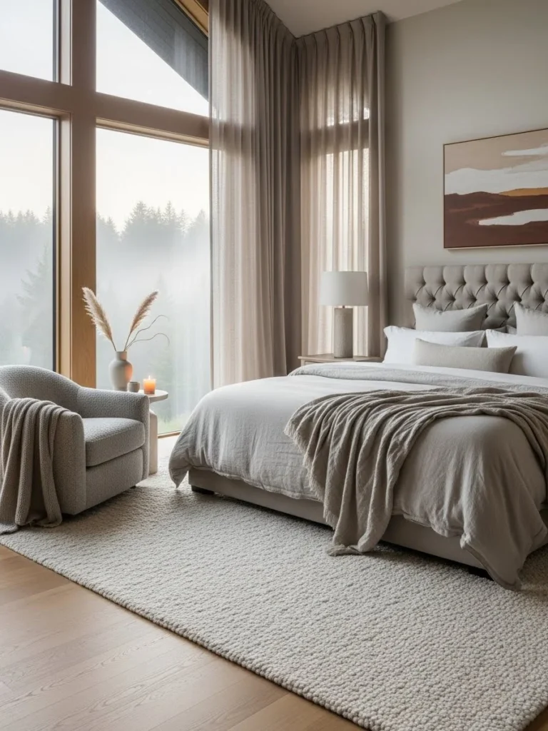 Soft textiles and neutral tones create a calming atmosphere. Furnishings are minimal yet luxurious.