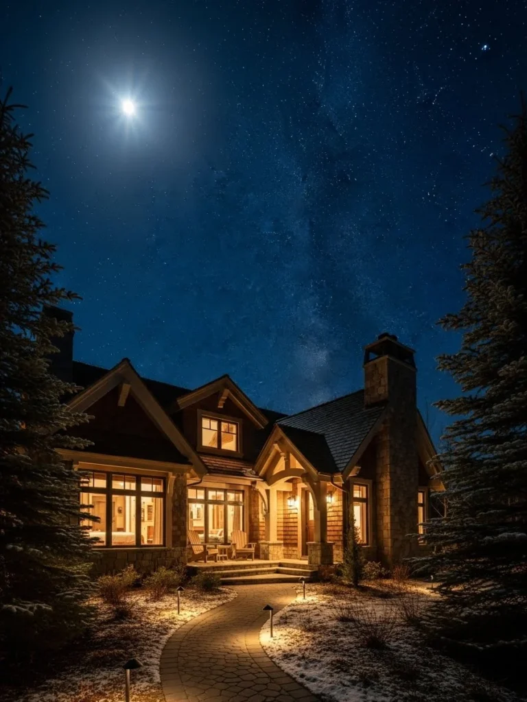 At night, this luxury cottage glows softly under a star-filled sky. Warm exterior lighting highlights textures and form.