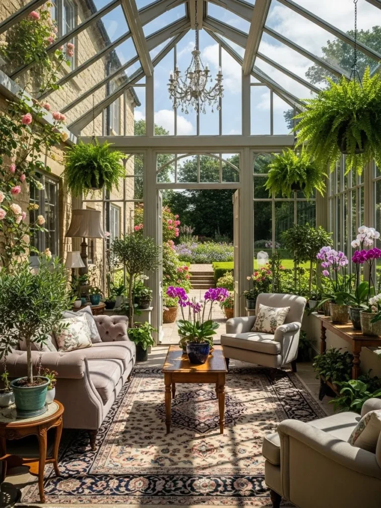 This luxury cottage features a glass conservatory filled with greenery and light. The structure connects indoor living with natural growth.