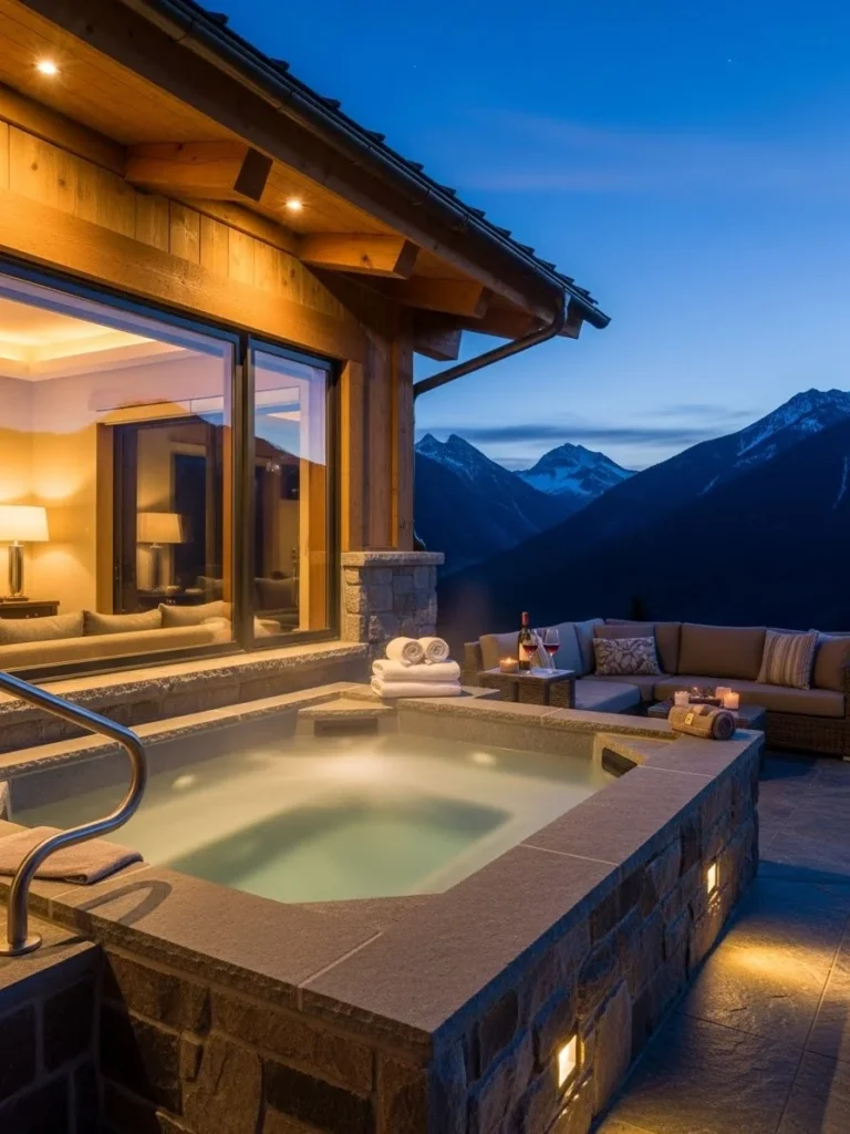 This luxury cottage is designed around wellness and relaxation, featuring an outdoor spa overlooking dramatic mountain scenery. The architecture emphasizes openness and connection to the landscape.