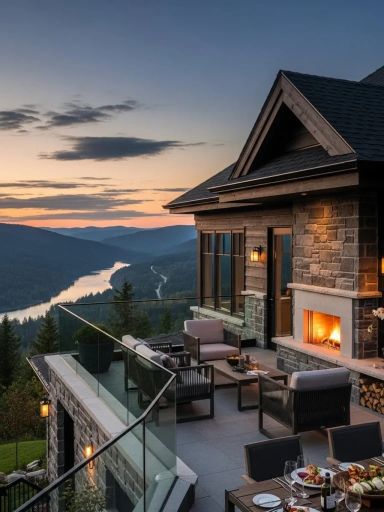 Outdoor amenities include a hot tub, fire features, and seating areas positioned for panoramic views. Transitions between indoors and outdoors feel seamless.