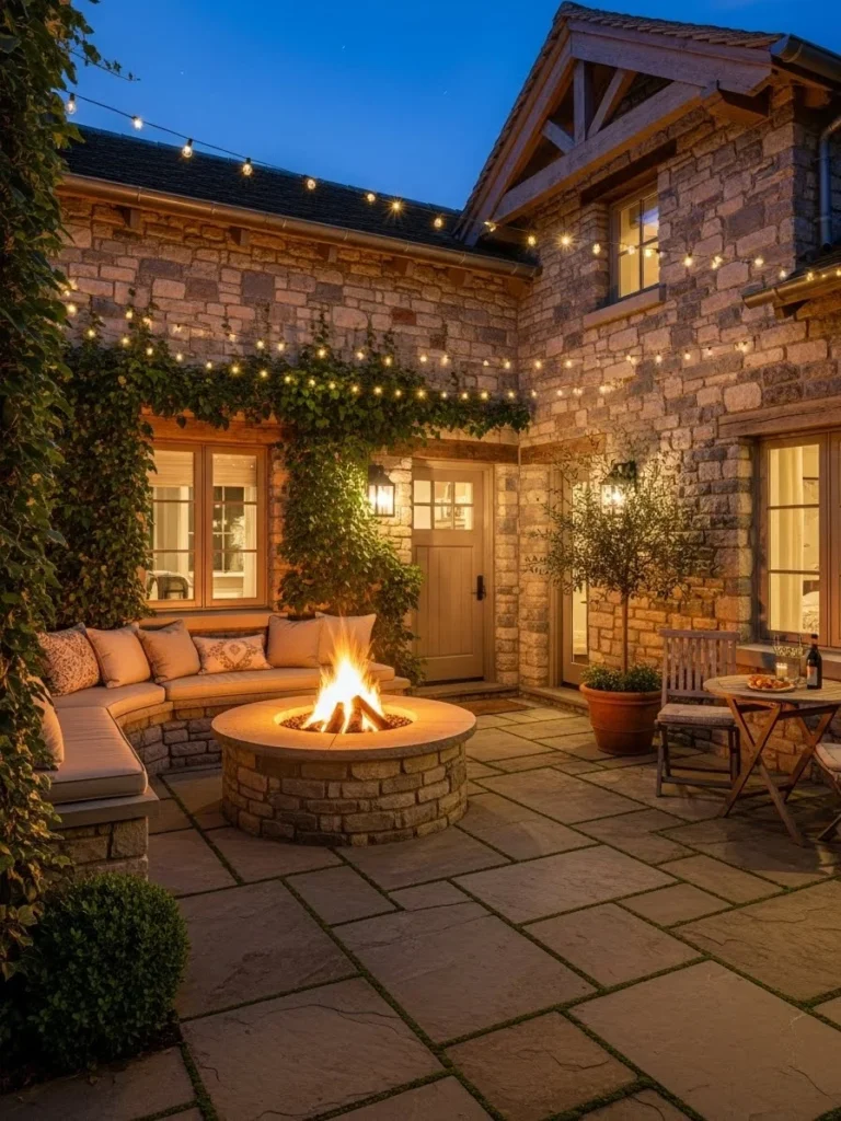 The fire pit becomes a focal point for evening relaxation. Warmth defines the atmosphere.
