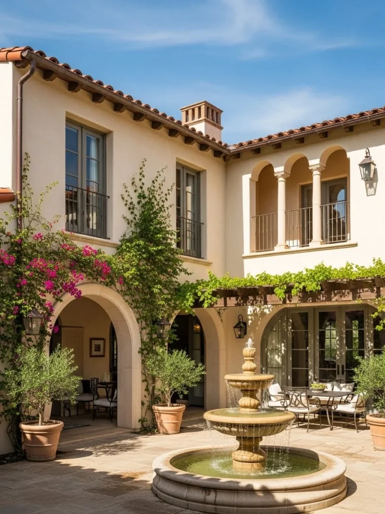 This Mediterranean luxury cottage is centered around an elegant courtyard featuring a tranquil fountain. Warm stone walls, arched doorways, and terracotta roofing define its classic regional character.
