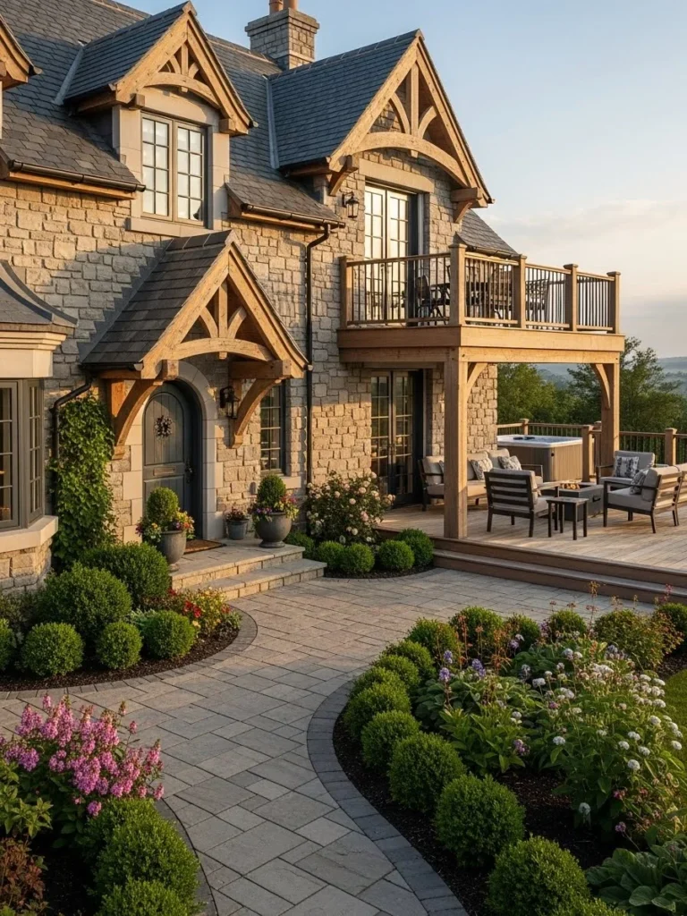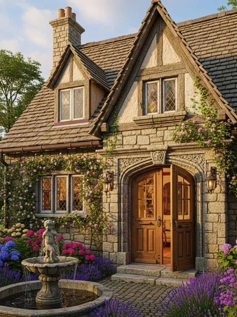 This old-world European luxury cottage showcases weathered stone and artisanal craftsmanship. Its presence feels historic and enduring.