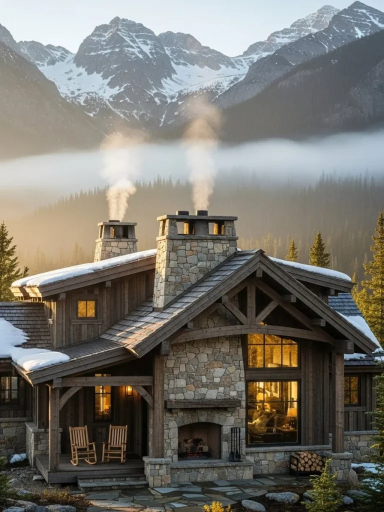 This rustic mountain luxury cottage blends strength and warmth through stone foundations and exposed timber beams. Set among towering peaks, it feels both protective and welcoming.