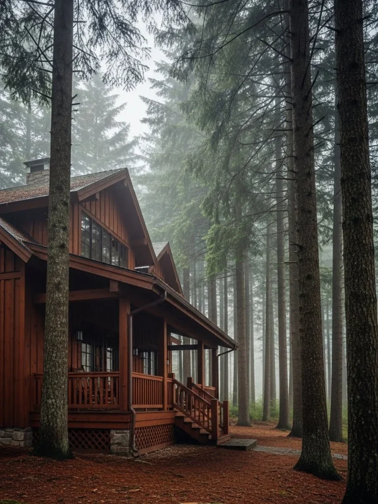 Hidden within towering pine trees, this forest retreat luxury cottage offers complete immersion in nature. Its dark wood exterior blends seamlessly with the forest, creating a sense of privacy and calm.