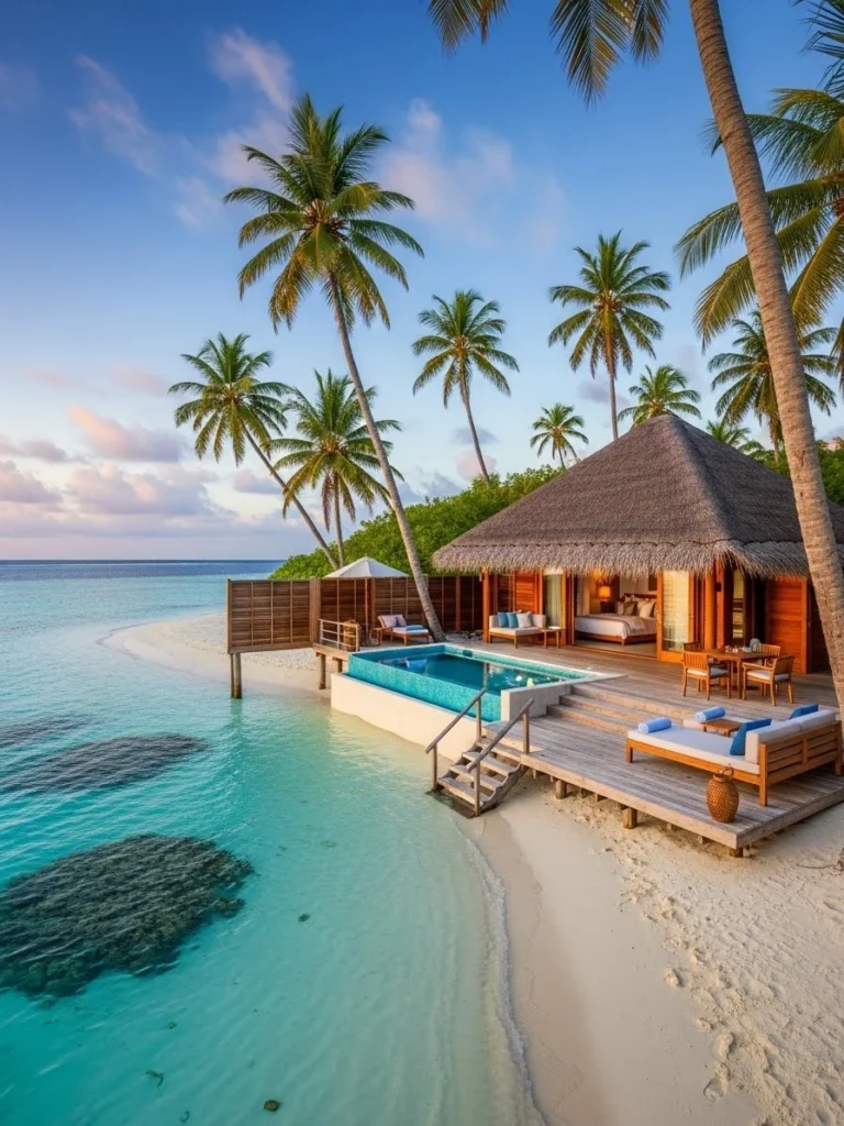 This secluded island luxury cottage rests on white sand surrounded by crystal-clear waters. Its design reflects tropical simplicity elevated through refined materials.
