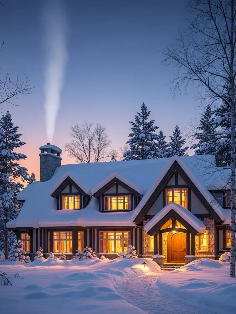 This winter luxury cottage glows softly beneath a snow-covered landscape at twilight. Smoke rises gently from the chimney, creating a comforting contrast to the cold surroundings.