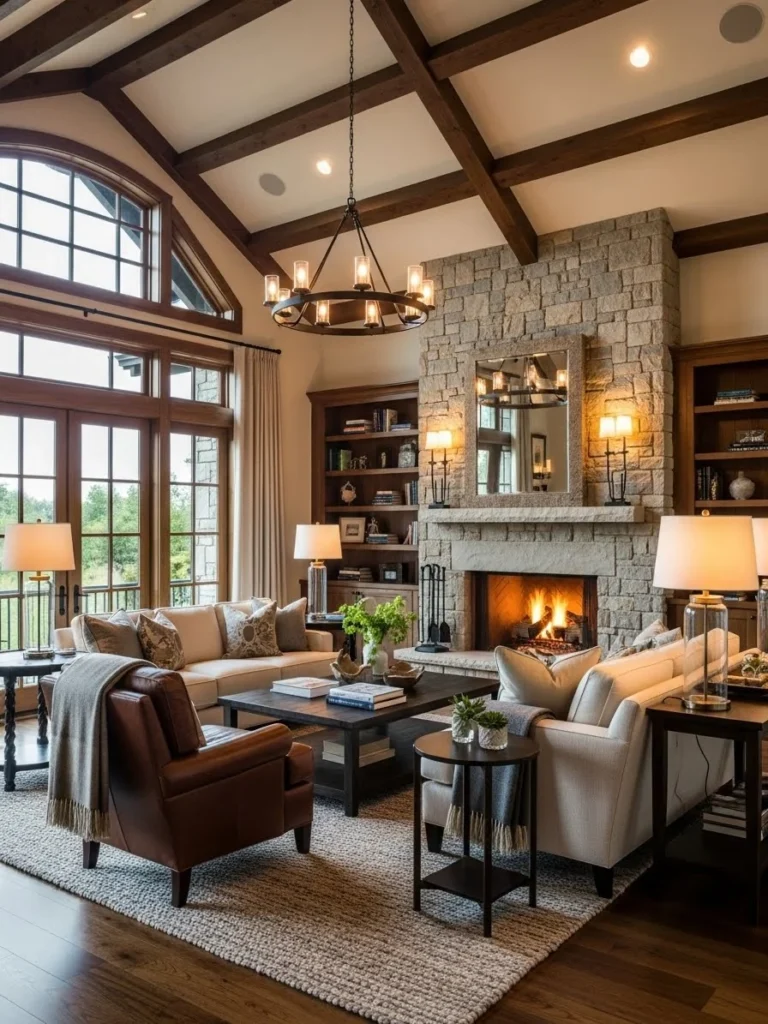 Light pours in through tall windows and skylights, emphasizing vertical space and highlighting handcrafted details. A central fireplace anchors the room, adding both visual focus and cozy comfort.