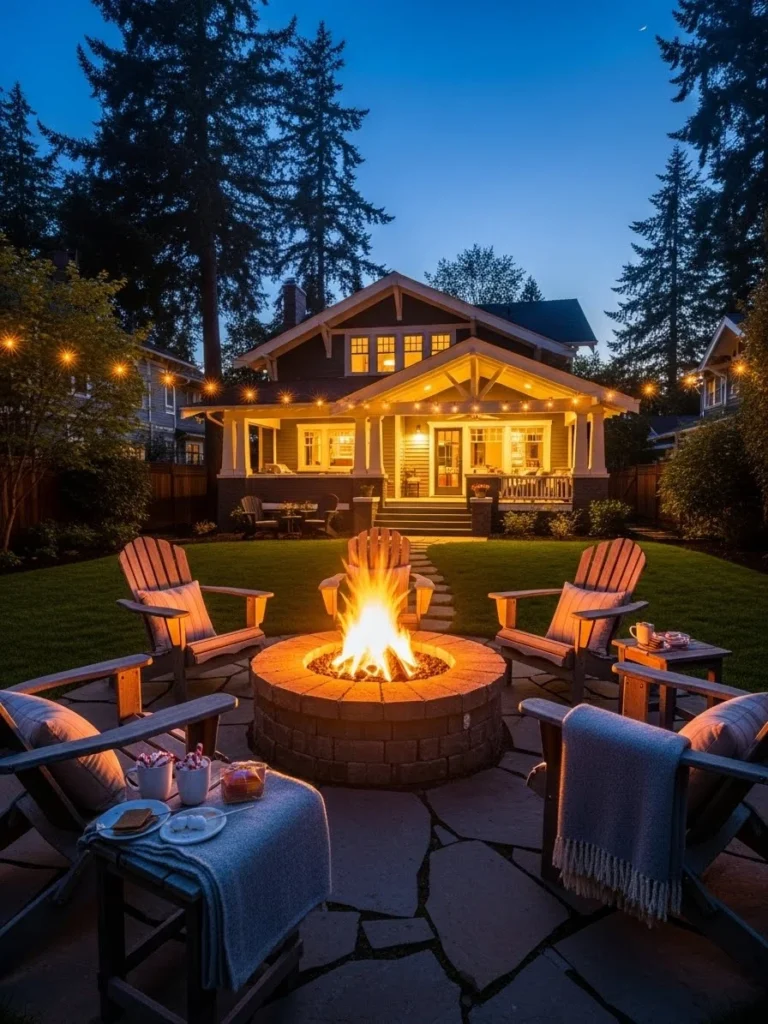 Backyard Craftsman Fire Pit Gathering Area At Twilight