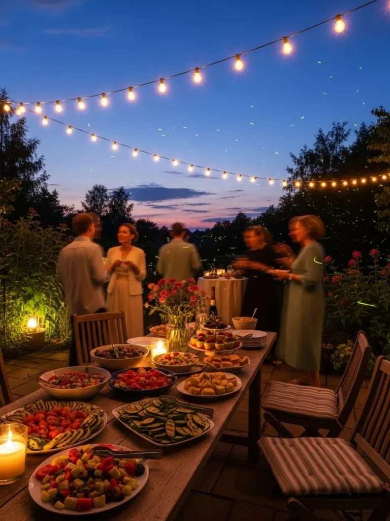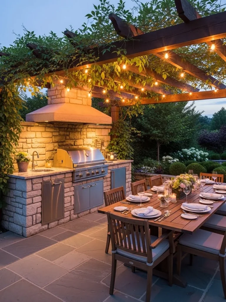 The atmosphere is convivial and celebratory. It’s a space designed for hosting and enjoying the culinary arts al fresco. The background shows a well-maintained garden blurring into the twilight.