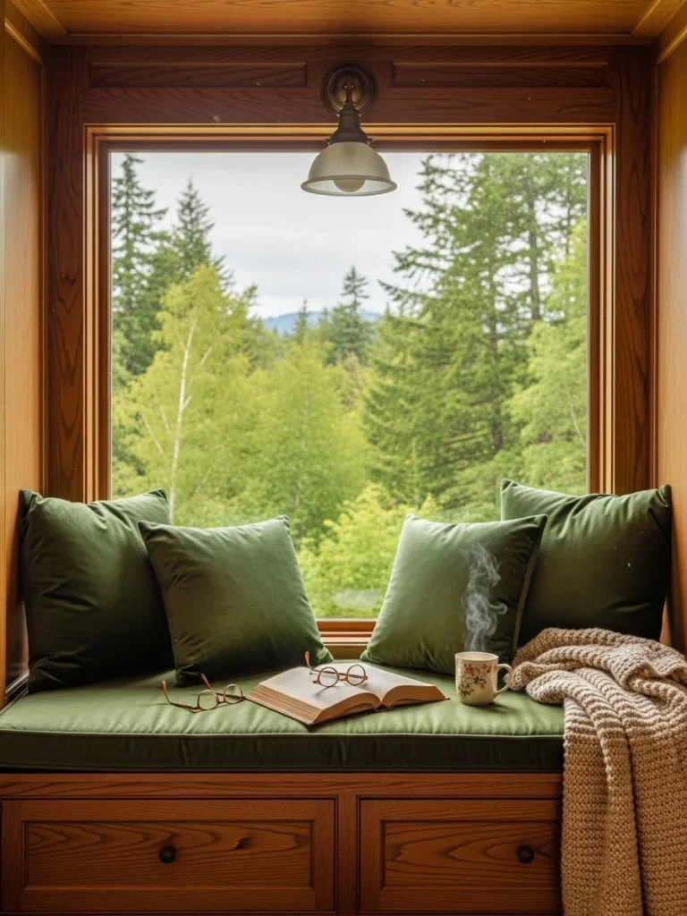 The nook is made ultra-comfortable with thick, custom-upholstered velvet cushions in a deep forest green, accented by varied throw pillows in complementary Arts and Crafts patterns. A large picture window framed by heavy molding offers a serene view of a dense forest outside, connecting the reader with nature. A vintage bronze wall sconce with a mica shade provides soft, directional reading light, adding to the warm ambiance.