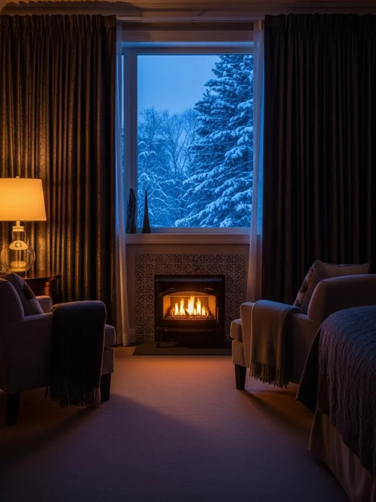 This photograph captures a deeply cozy evening scene in a master bedroom, featuring a private fireplace as the ultimate luxury amenity. A small, highly efficient gas fireplace with a handcrafted artisan tile surround and a chunky wood mantel glows warmly in the corner of the room. Two plush, velvet armchairs are pulled up close to the hearth, with a cashmere throw blanket draped over one.