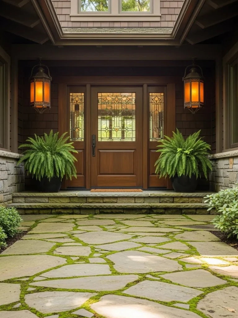 A close-up, low-angle shot focuses on the inviting journey to the front door, emphasizing the tactile details that define a luxury Craftsman entrance. The foreground is dominated by a meticulously laid flagstone walkway, featuring large, irregularly shaped slabs of natural stone in varied hues of slate blue, rust, and tan. Moss and creeping thyme growing in the joints between the stones add an established, organic feel, suggesting the home has been part of the landscape for decades.