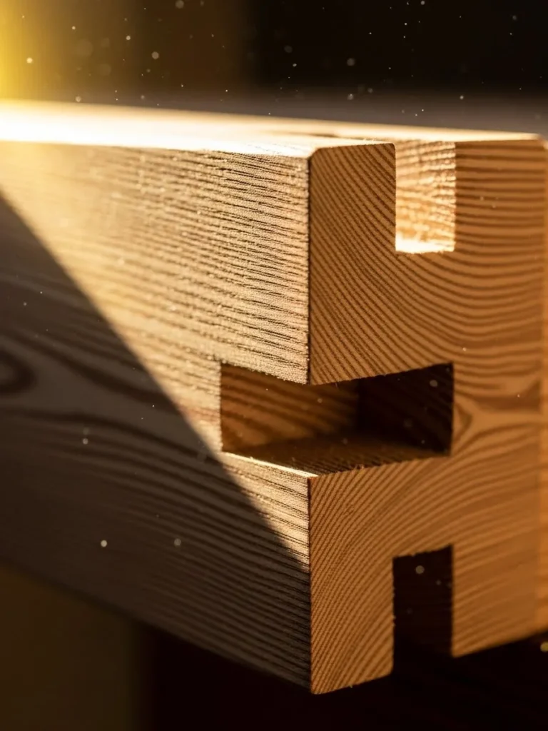 The level of detail is microscopic. The viewer can see the tight grain of the slow-growth wood, the slight imperfections and tool marks left by the craftsman’s hand planes and chisels, and the rich patina of the oiled finish. Dust motes dance in a narrow sunbeam that cuts across the joint, highlighting the three-dimensional texture.