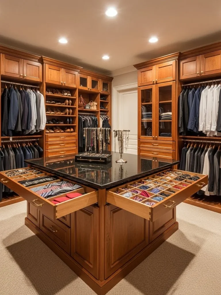 In the center of the room sits a large island with a polished granite countertop, providing a surface for laying out accessories or packing suitcases. The island houses specialized drawers for jewelry and watches. One entire wall is dedicated to built-in angled shoe shelving, illuminated by integrated LED strip lighting, making a collection of footwear look like a boutique display.