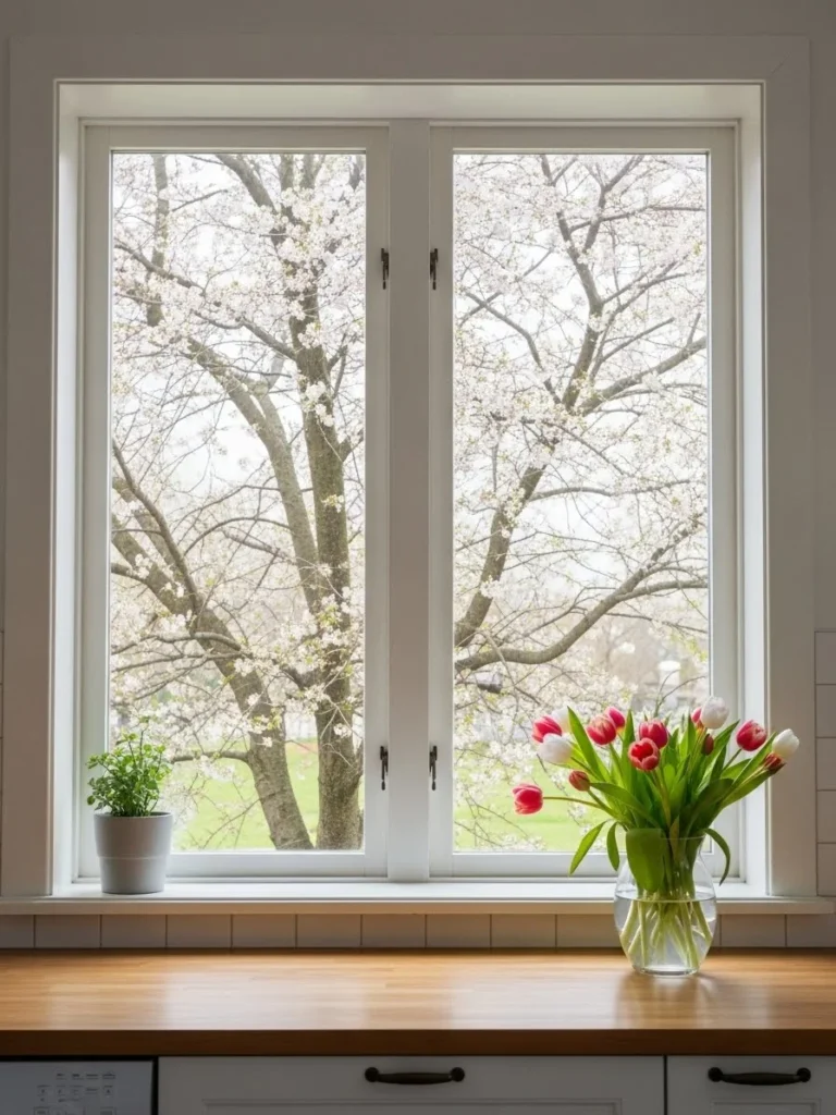 The atmosphere is refreshing, hopeful, and energizing. It embodies the feeling of new beginnings and the end of winter. The interior of the kitchen feels clean and airy, connected to the vibrant life outside.