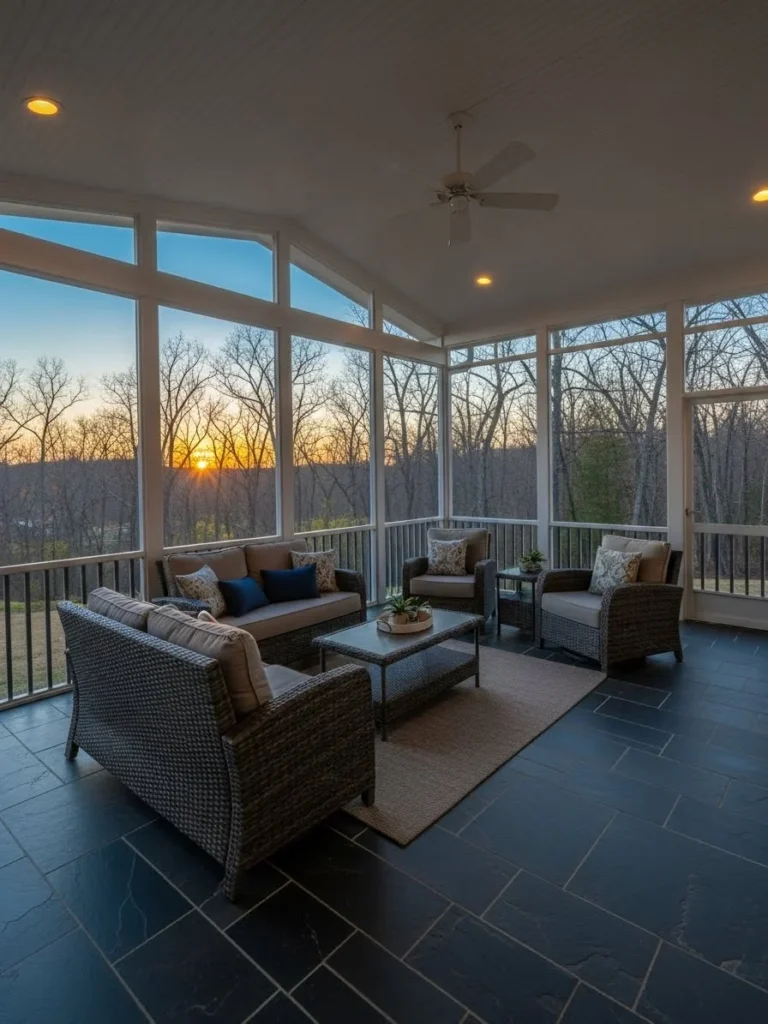 This interior photograph captures the serene ambiance of a spacious screened-in back porch during the “blue hour” just after sunset. The flooring is durable, cool slate tile laid in a running bond pattern. A high-quality, dark woven wicker furniture set with thick, weather-resistant cushions in a neutral beige offers ample seating for a group.
