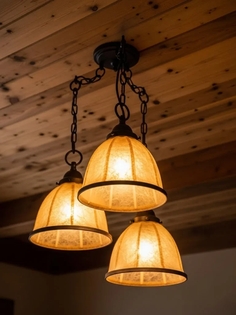 The pendants hang at staggered heights from dark, wrought-iron chains and fixtures that feature hammered textures and subtle geometric cutouts. The ceiling above is clad in tongue-and-groove Douglas fir, adding another layer of warm wood tone to the image.