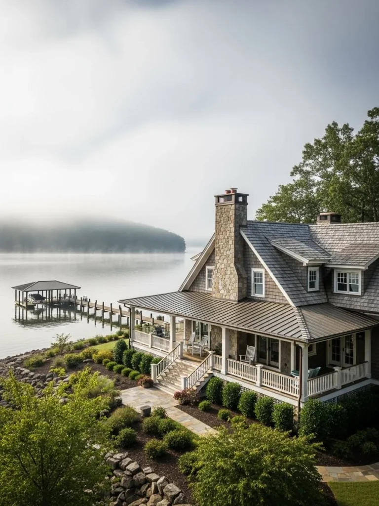 The materials chosen for this lakeside retreat are both durable and beautiful, designed to weather gracefully over time. Natural wood shingles covering the exterior are beginning to turn a distinguished silver-grey, blending seamlessly with the misty morning atmosphere and the tones of the water. A massive stone chimney rises along the side of the house, anchoring the structure visually and promising a cozy hearth inside for cool lake evenings. A private wooden dock extends into the water, complete with a boat lift, solidifying the lifestyle offering.