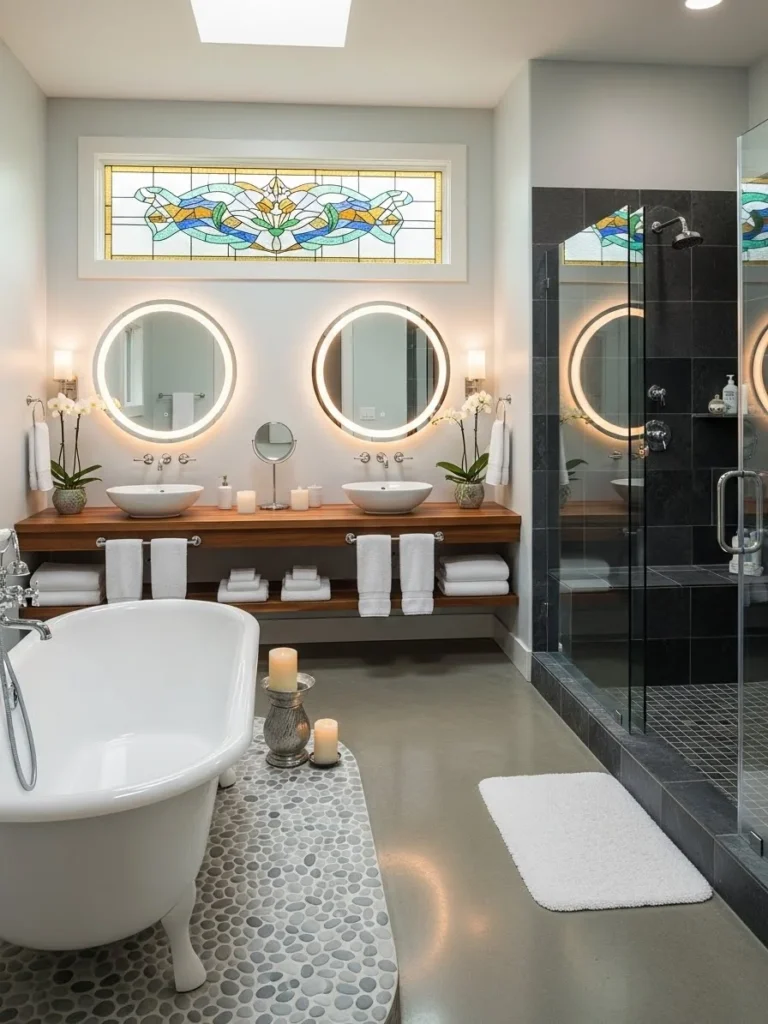 Beyond the tub is an expansive walk-in steam shower enclosed in frameless glass. The shower interior is clad in large-format slate tiles in varying shades of charcoal and rust, featuring multiple showerheads and a built-in bench. A long dual vanity made of reclaimed wood supports two stone vessel sinks, illuminated by soft, diffused lighting from sconces. A stained glass window provides privacy while admitting colored light.