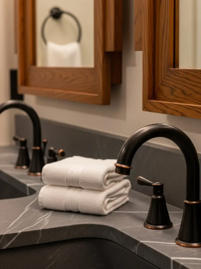 This macro shot zooms in on the exquisite details of a luxury bathroom vanity, emphasizing material quality and finish. The focus is on an oil-rubbed bronze wide-spread faucet with cross handles, showing the subtle coppery highlights where the dark finish has been “rubbed” on the edges. Water droplets are visible on the metal, adding realism.