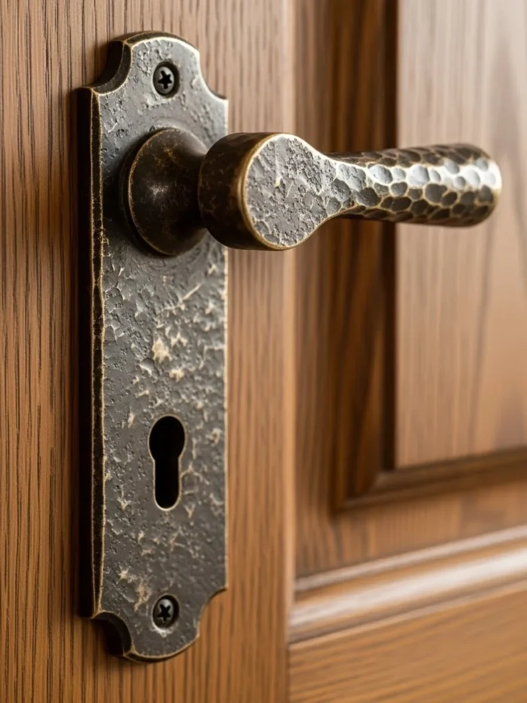 Macro Shot Of Heavy Hammered Bronze Door Hardware