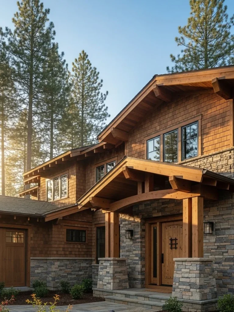 Modern Craftsman Home Facade With Mixed Wood And Stone