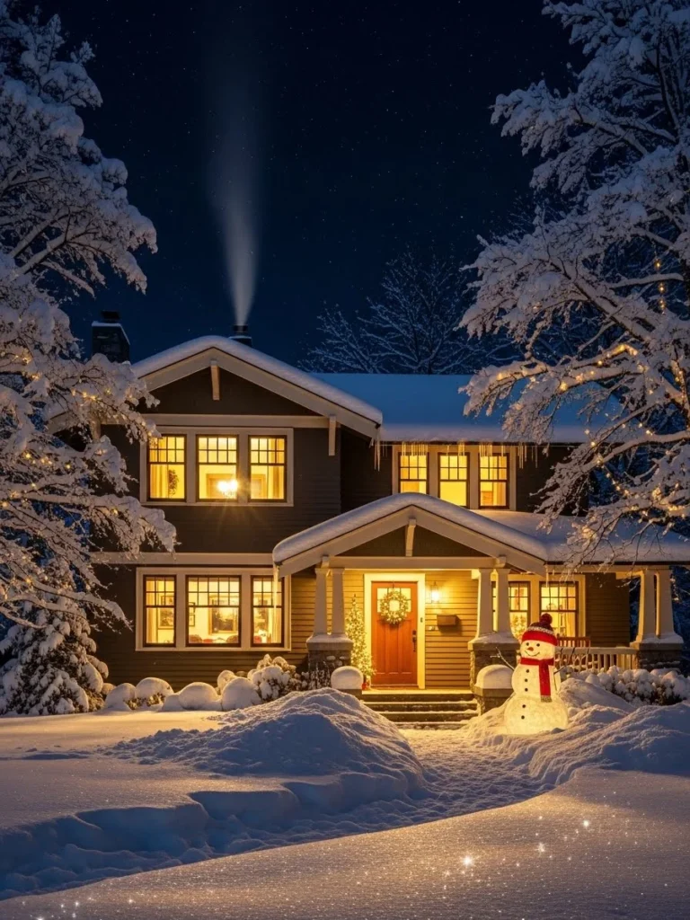 This image taps into the powerful psychological desire for a secure, warm sanctuary. It illustrates the robustness of Craftsman architecture against the elements. It appeals to homeowners in cold climates who want their home to feel like a cozy fortress against winter weather.