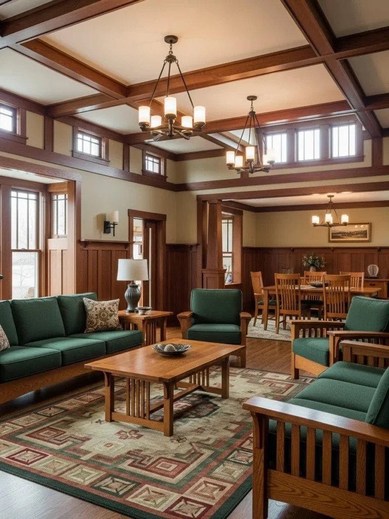 The furniture selection reinforces the architectural style. The living zone features comfortable Mission-style sofas and armchairs, while the dining area centers around a large, solid wood trestle table surrounded by high-backed Rennie Mackintosh-inspired chairs. A large, colorful Arts and Crafts wool area rug under the dining set adds pattern and defines the eating zone.