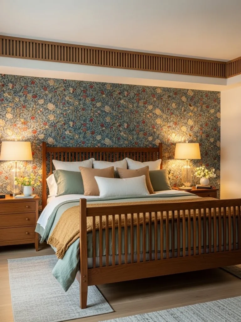 This photograph captures a master bedroom suite designed as a true sanctuary, deeply rooted in the Arts and Crafts philosophy. The bed is a massive, king-sized Stickley-style piece made of solid quarter-sawn oak with prominent mortise and tenon joinery. Behind the bed, a stunning accent wall is covered in authentic William Morris wallpaper, featuring a complex, nature-inspired pattern of swirling leaves and birds in deep greens, blues, and golds.