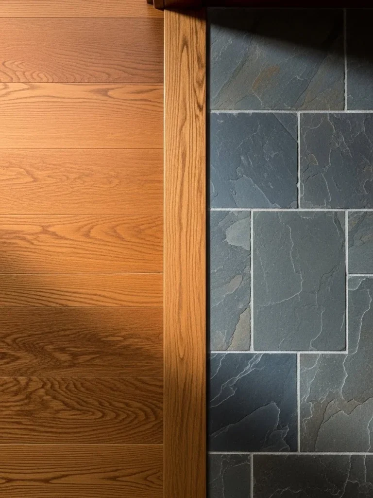 Separating the two materials is a perfectly fitted, substantial wooden threshold piece that matches the oak flooring. The grout lines in the slate are precise and dark. The lighting is even and neutral, designed to showcase the true colors and textures of the materials without dramatic shadows.