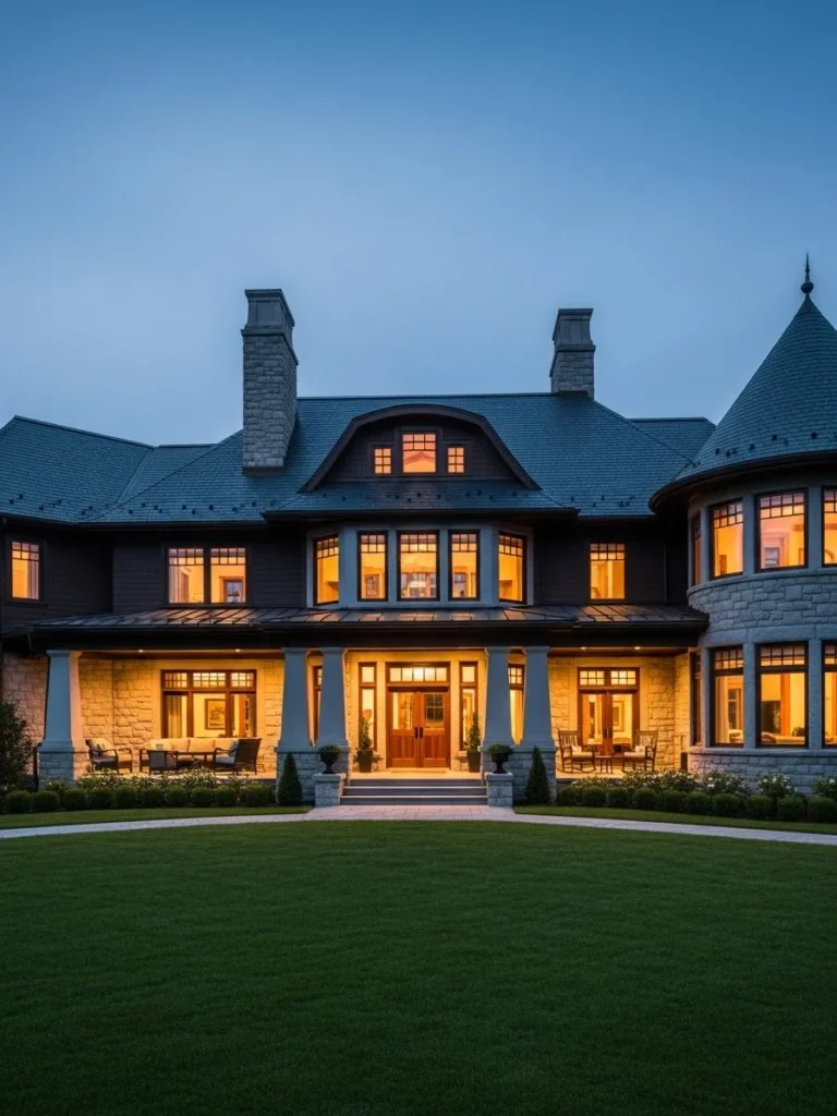 The atmosphere evokes a sense of peaceful permanence, history, and exclusive comfort. It’s a home designed for generations, radiating warmth and security as the day transitions into night. The cinematic lighting highlights the varied textures of wood and stone, suggesting an interior filled with similar richness—perhaps roaring fireplaces and comfortable leather furniture awaiting inhabitants. It represents a sanctuary away from the bustle of modern life, nestled in a serene, exclusive setting.